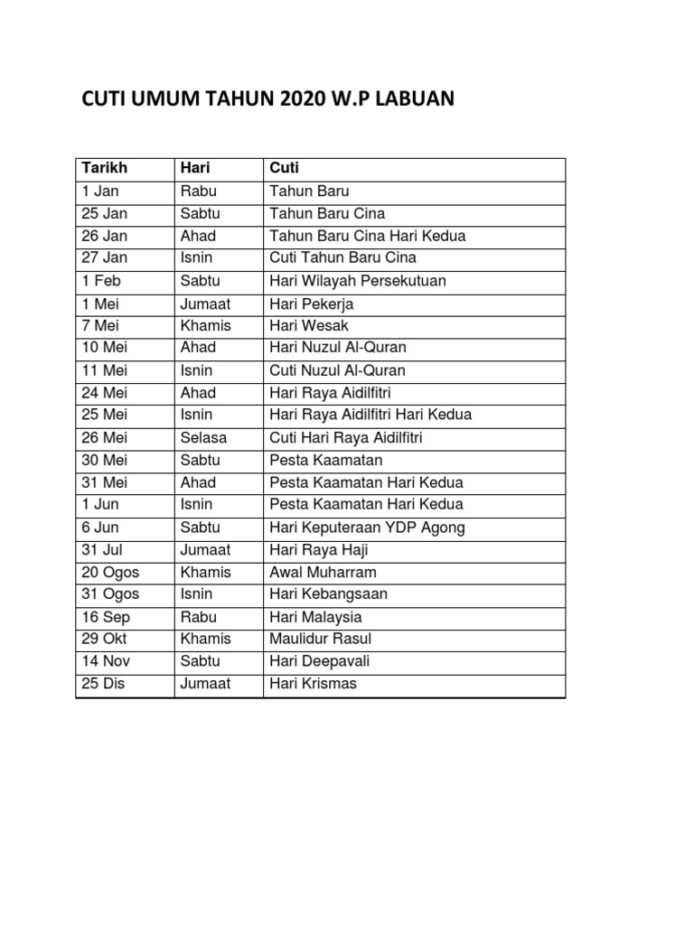 Senarai cuti umum atau hari kelepasan am untuk cuti umum di malaysia dibahagikan kepada dua iaitu untuk peringkat kebangsaan dan juga untuk peringkat negeri. Apa plan tahun ini, pergi bercuti? Tatal ke bawah untuk melihat senarai cuti umum 2020 johor, cuti umum 2020 kpm, 2020 sabah, atau pilih kalendar negeri anda mengikut keperluan. Last updated ( monday, 14 october 2019 ). Hari kelepasan am bagi negeri pahang pada tahun 2020 untuk perhatian rakyat di negeri pahang portal rasmi majlis daerah lipis mdl.