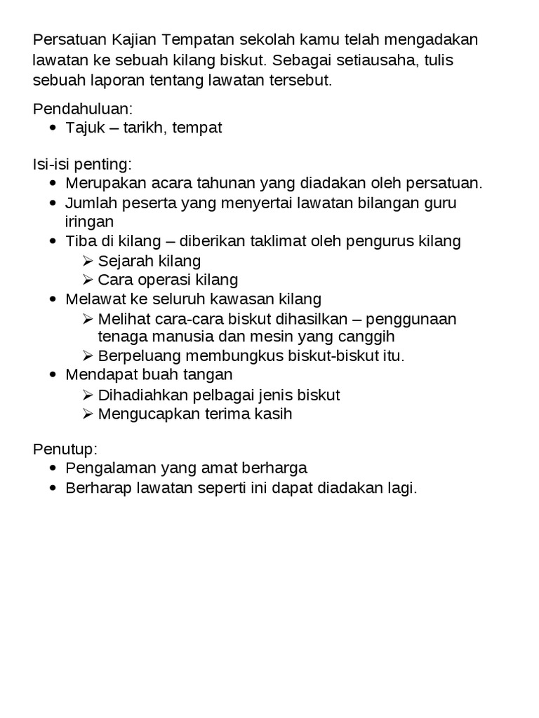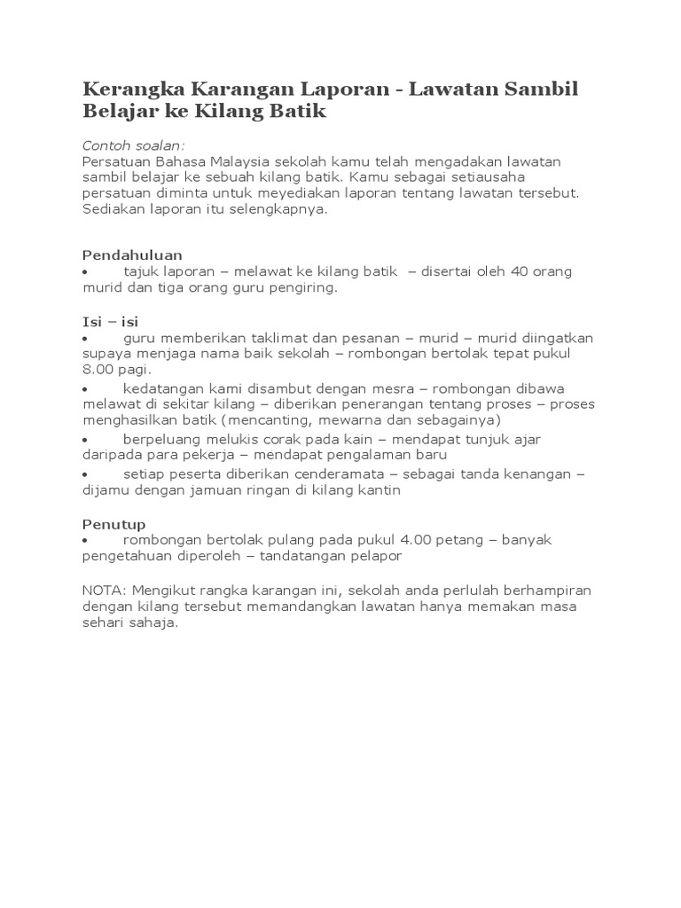 Lawatan Sambil Belajar Ke Kilang Cheung Woh Technologies Seberang Prai from www.jmti.gov.my Anjuran persatuan bahasa melayu sk bakong. Tempat lawatan tarikh waktu anggota rombongan : Kami berkumpul di perkarangan sekolah pada pukul $.%% pagi dan. Sambil melihat, kami membuat catatan. Lembu tag kilang pembuatan coklat bery'ls. Persatuan bahasa melayu sekolah kamu telah mengadakan satu lawatan sambil belajar ke sebuah kilang membuat kain batik. Sebagai setiausaha persatuan bahasa melayu, kamu dikehendaki menulis sebuah laporan tentang lawatan tersebut. Bersama cikgu aziz, ketua rombongan kali ini pada 31 julai 2008.