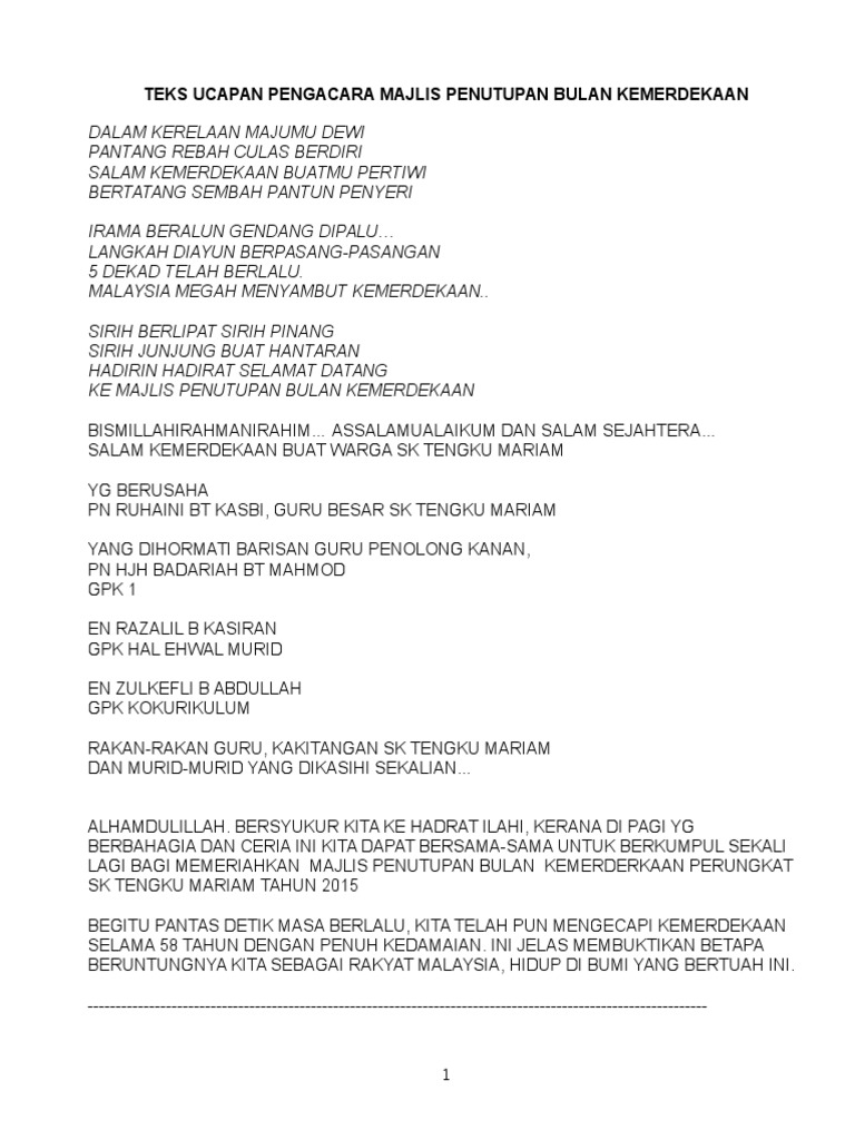 (DOC) TEKS PENGACARA MAJLIS SAMBUTAN BULAN KEMERDEKAAN ... from 0.academia-photos.com Use the download button below or simple online reader. Nyanyian lagu tema bulan kemerdekaan hadirin yang dihormati, majlis diteruskan lagi dengan nyanyian lagu tema bulan kemerdekaan. Documents similar to teks pengacara majlis pelancaran bulan kemerdekaan.docxs. Faizuddin hashim @teks pengerusi majlis. 4) selamat datang ke majlis pelancaran bulan kemerdekaan peringkat sk taman molek. We are a sharing community. Membawakan dari auditorium seri perdana ,pertandingan pidato peringkat daerah jasin melaka bandaraya bersejarah. Deejaykahwin.com merupakan sebuah perniagaan 100% milik melayu bumiputera yang menjalankan perniagaan perkhidmatan.